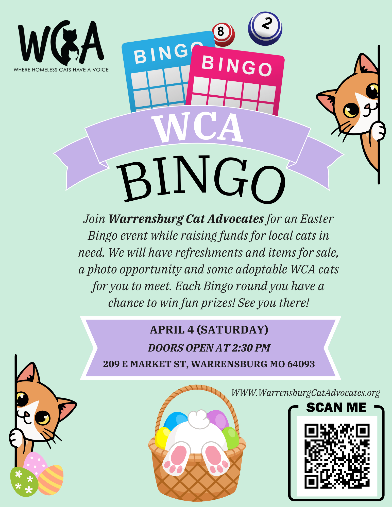 Join Warrensburg Cat Advocates for a Valentine’s Bingo event while raising funds for local cats in need. We will have refreshments and items for sale, a photo opportunity and some adoptable WCA cats for you to meet. Each Bingo round you have a chance to win fun prizes! See you there!